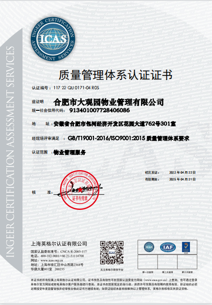 合肥市大觀(guān)園物業(yè)管理有限公司于2022年4月22日榮獲質(zhì)量管理體系認(rèn)證證書(shū),這是對(duì)我們工作和服務(wù)質(zhì)量的認(rèn)可,未來(lái)我們會(huì)繼續(xù)提供更優(yōu)質(zhì)的服務(wù)。